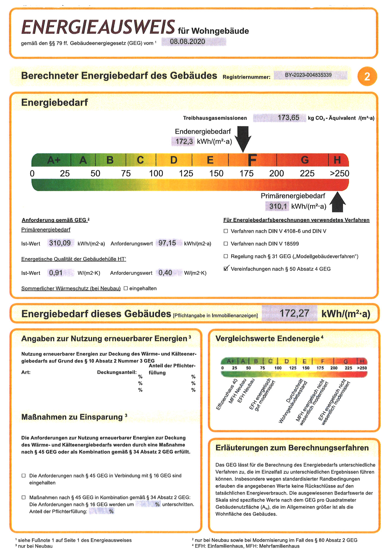 Energiebedarfsausweis vom 29.11.2023. Energiebedarfskennwert: 172,27 kWh/(m²a), inkl. Warmwasser. Baujahr 1970. Baujahr Wärmeerzeuger 1981. Energieeffizienzklasse F.